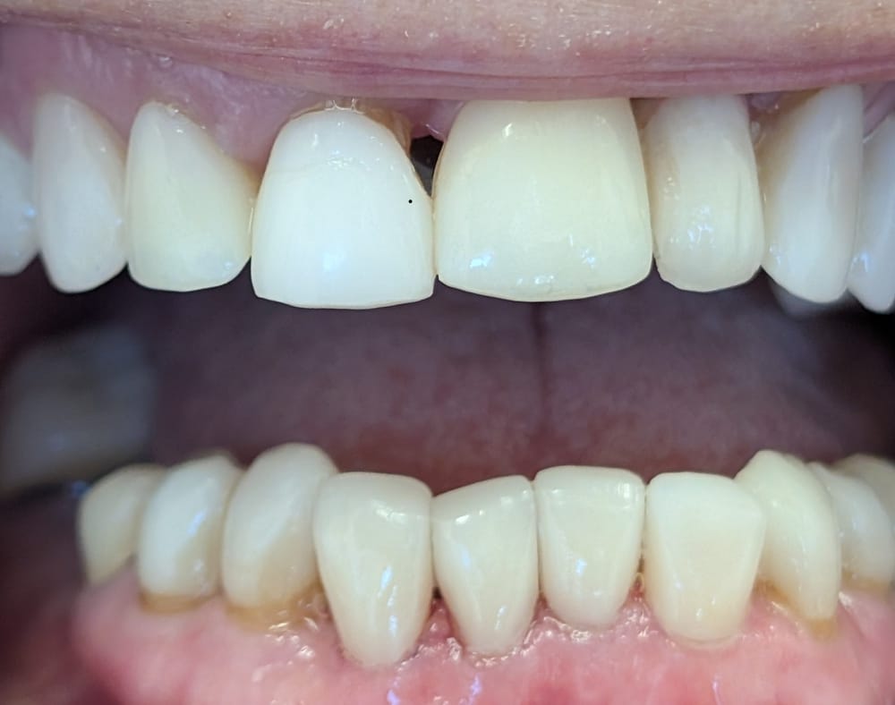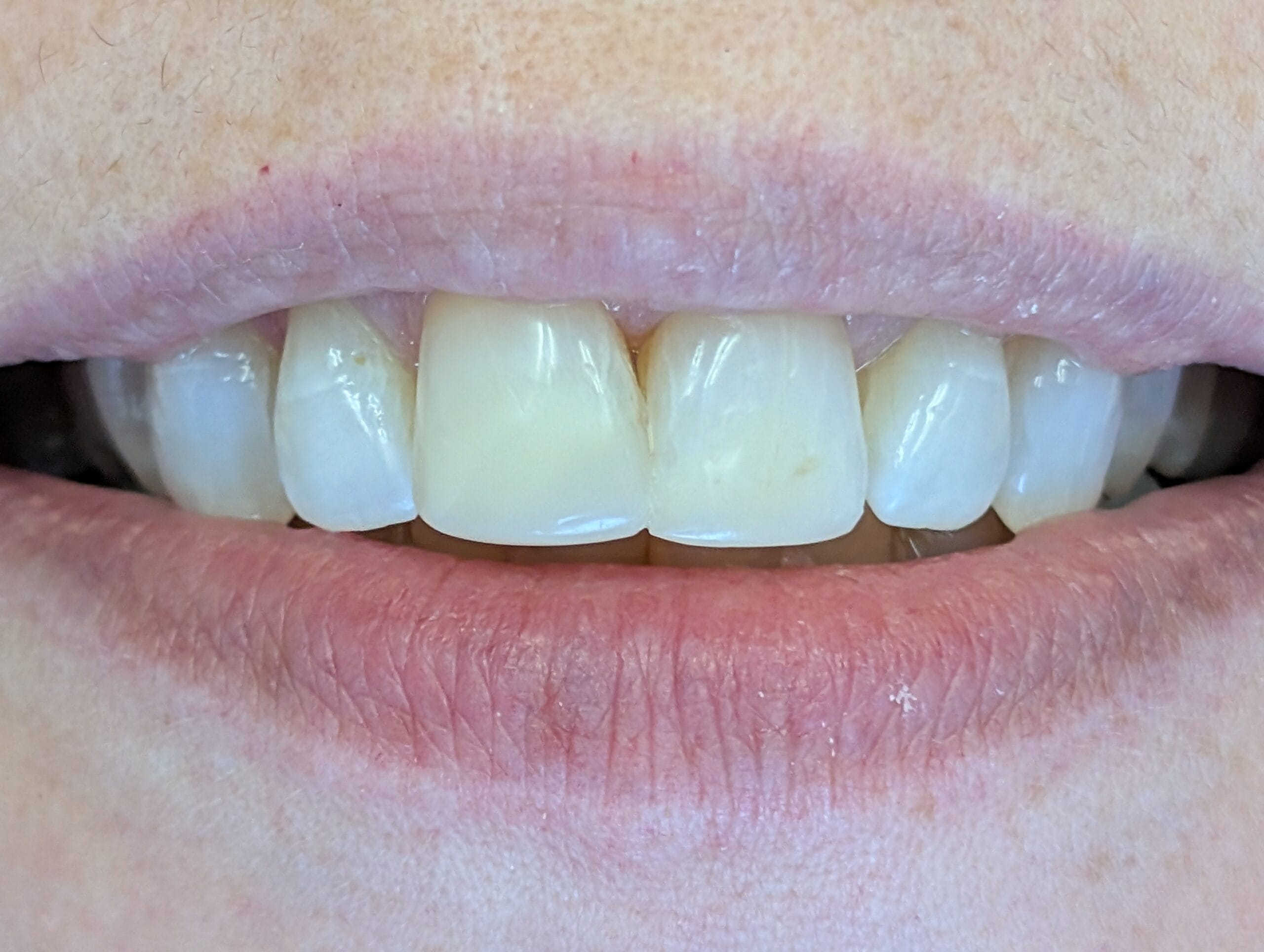 This patient wasn’t happy with her uneven smile and noticed that her teeth were getting shorter over time.