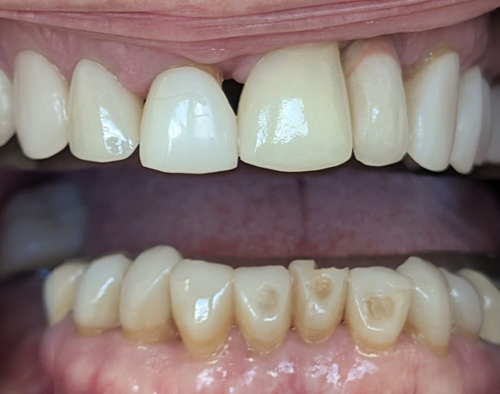Vicky was unhappy with her uneven smile and dark front teeth. Using porcelain crowns on her upper and lower teeth, we created the beautiful white smile she has always wanted!